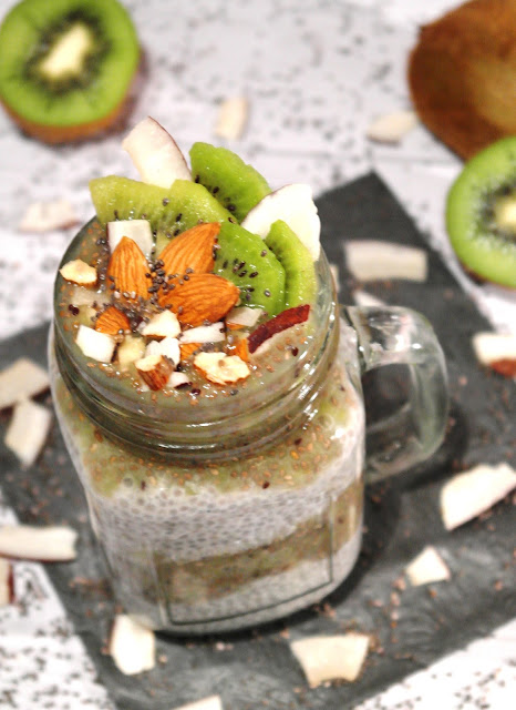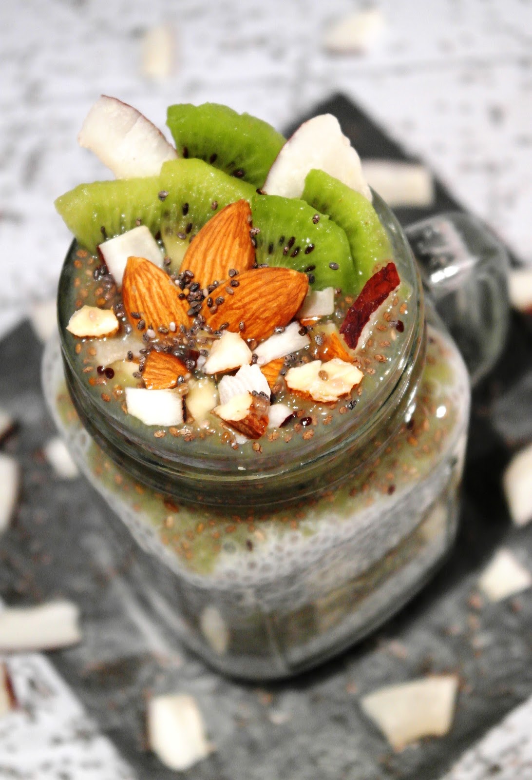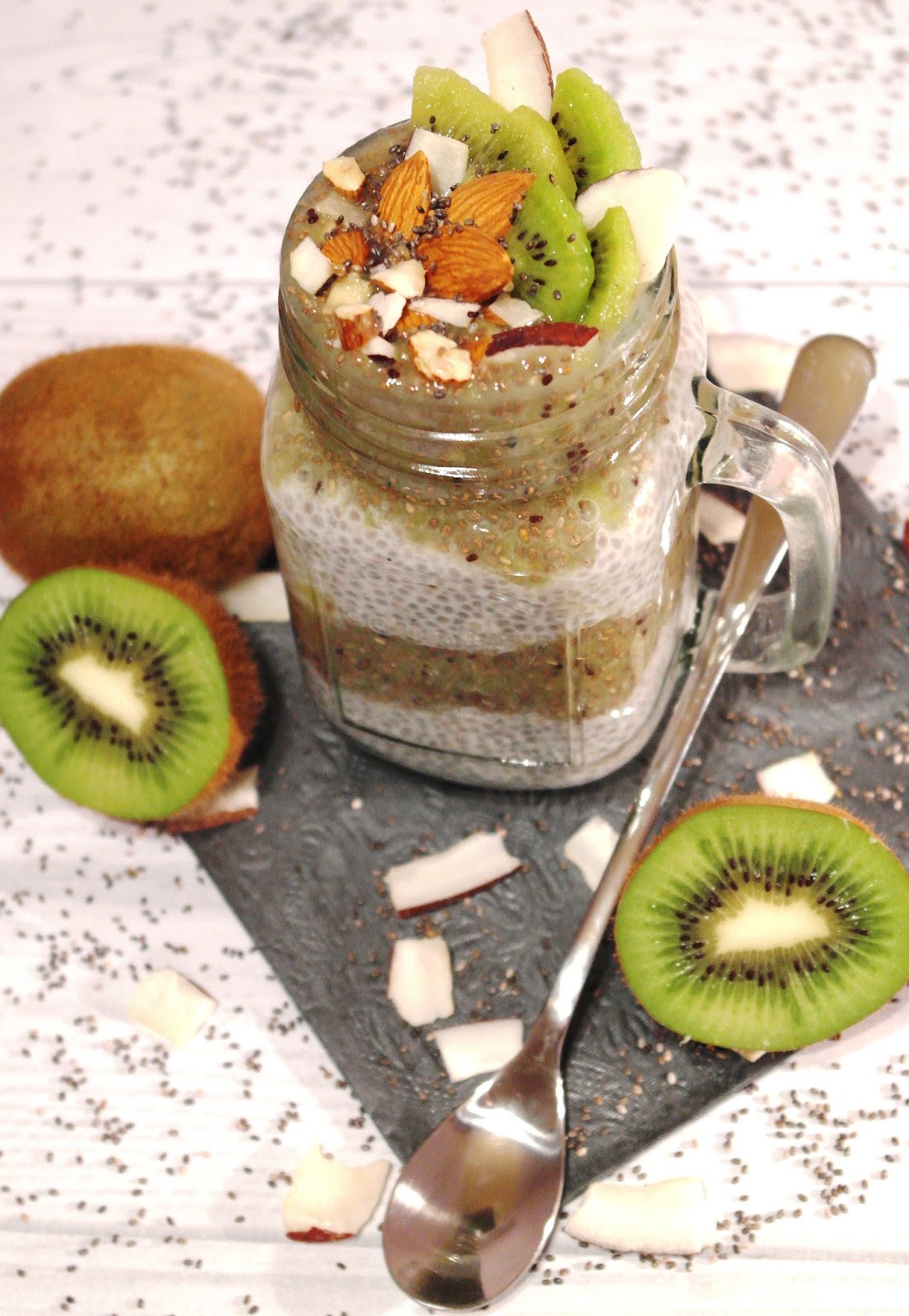 Wykonanie:Zielona warstwa: w ciepłej wodzie rozpuścić 1,5 łyżki ksylitolu. Po przestudzeniu dodać obrane kiwi i zmiksować na gładką masę. Następnie dodać 3 łyżki chia, wymieszać i przelać do miseczki. Biała warstwa: podgrzewamy mleko kokosowe i dodajemy do niego ksylitol. Wsypujemy nasiona chia, mieszamy i zawartość wlewamy do nowej miseczki. Obie miseczki odstawiamy na kilka godzin (w lodówce lub na blacie kuchennym). Przelewamy na zmianę zawartość dwóch miseczek (tak by utworzyć 2 kolorowe warstwy) do przezroczystego kieliszka, pucharka lub słoiczka. Na koniec dekorujemy orzechami, wiórkami kokosowymi i owocami.