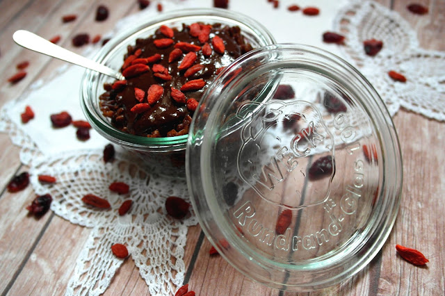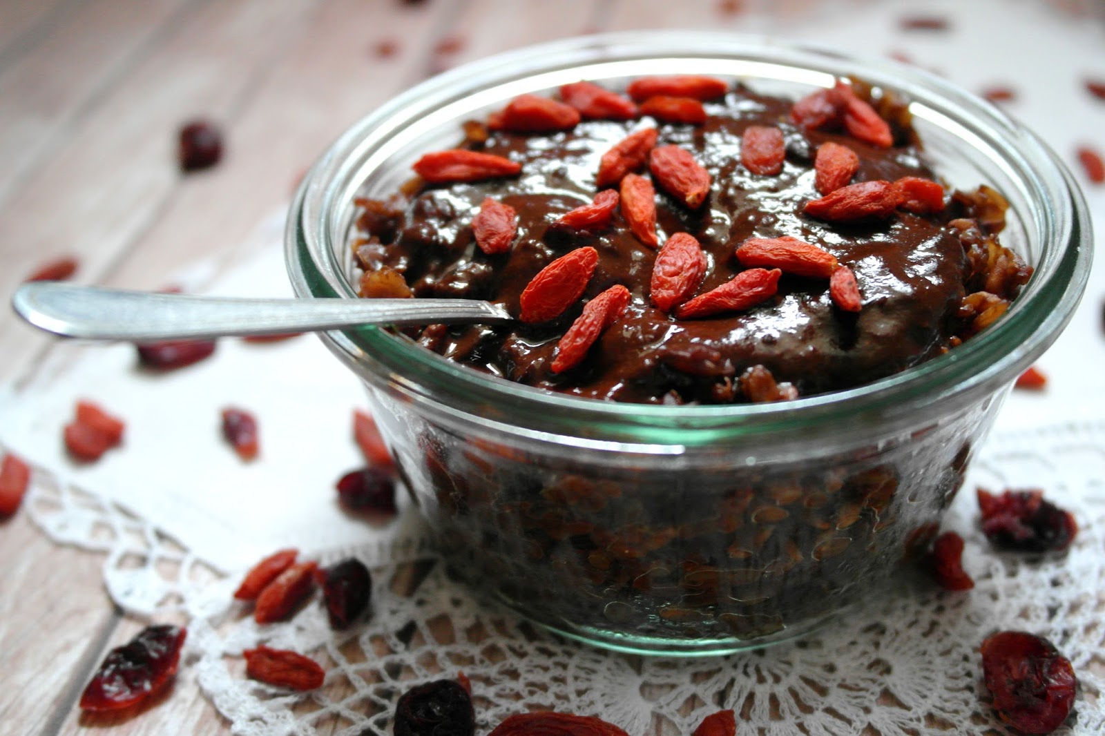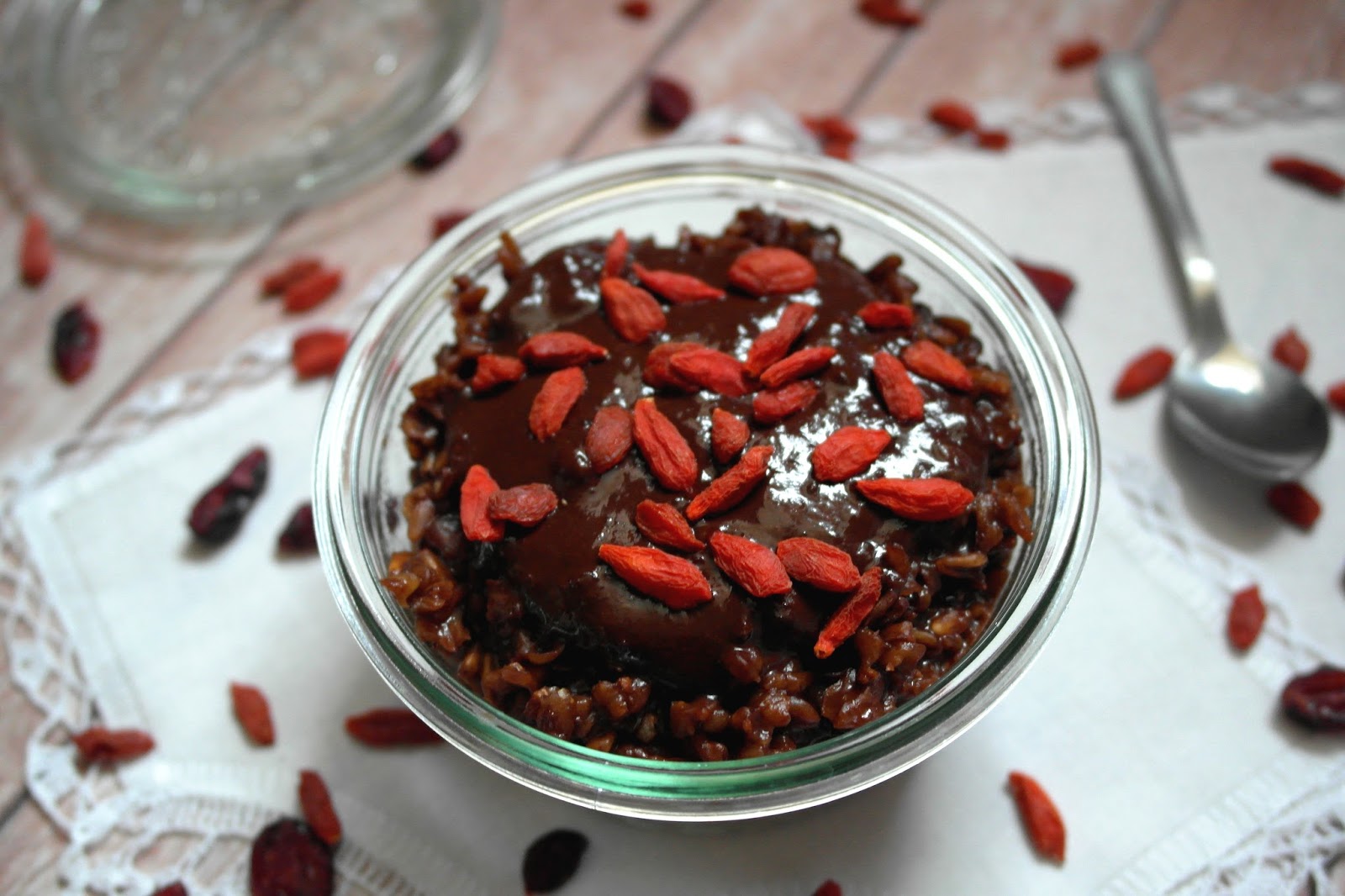 Jeszcze ciepłe płatki przełożyć do miseczki, polać musem czekoladowym i posypać jagodami goji lub żurawiną.