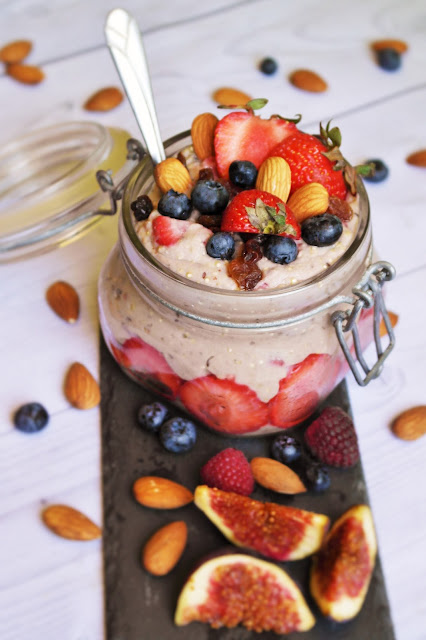 Przypomnę również, że QUINOA nie zawiera GLUTENU i ma NISKI INDEKS GLIKEMICZNY, więc bezglutenowcy i cukrzycy powinni na stałe wprowadzić ja do swojego jadłospisu! Zapraszam zatem na moją smaczną propozycję czyli KOMOSANKĘ z MASŁEM MIGDAŁOWYM, TRUSKAWKAMI i BIAŁKIEM TRUSKAWKOWYM.