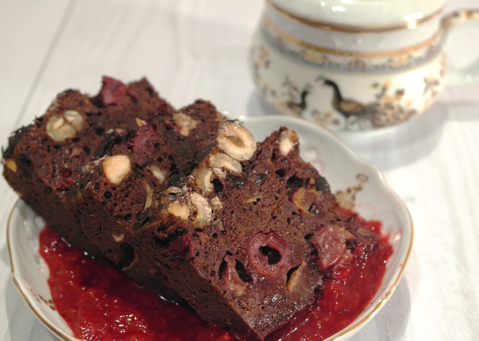 Moje GRYCZANE CIASTO jest niesamowicie wilgotne, dzięki dużej ilości owoców. Poza tym jest przyjemnie kwaśne bo wykorzystałam w tym przepisie WIŚNIE. Ma posmak chrupiących orzechów laskowych i czekoladowy posmak czekolady, bo dodałam kakao oraz karob. A to wszystko polane jest jeszcze sosem wiśniowym...mmhhmm wyobraźcie sobie ten smak ;-))) A najlepiej sami sprawdźcie w swojej kuchni, piekąc to pyszne CZEKOLADOWO-WIŚNIOWO-ORZECHOWE CIACHO Z SOSEM OWOCOWYM ;-D