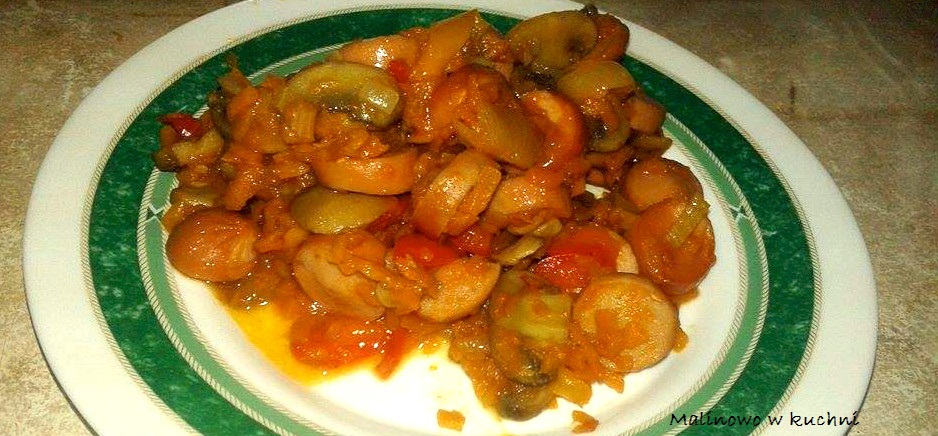 Przygotowanie:Pieczarki pokroić w plastry wrzucić do wysokiego rondla z tłuszczami i dusić. W tym czasie obrać marchewki i zetrzeć na tarce z grubymi oczkami, dodać do pieczarek. Cebulę pokroić w półplastry, zeszklić i dodać do warzyw. Paprykę pokroić w paski i dodać do garnka. Parówki pokroić w plasterki, przesmażyć na smalcu (możemy pominąć, ale przesmażone są smaczniejsze) i przełożyć do warzyw. Całość doprawić, dodać koncentrat. SMACZNEGO!!!