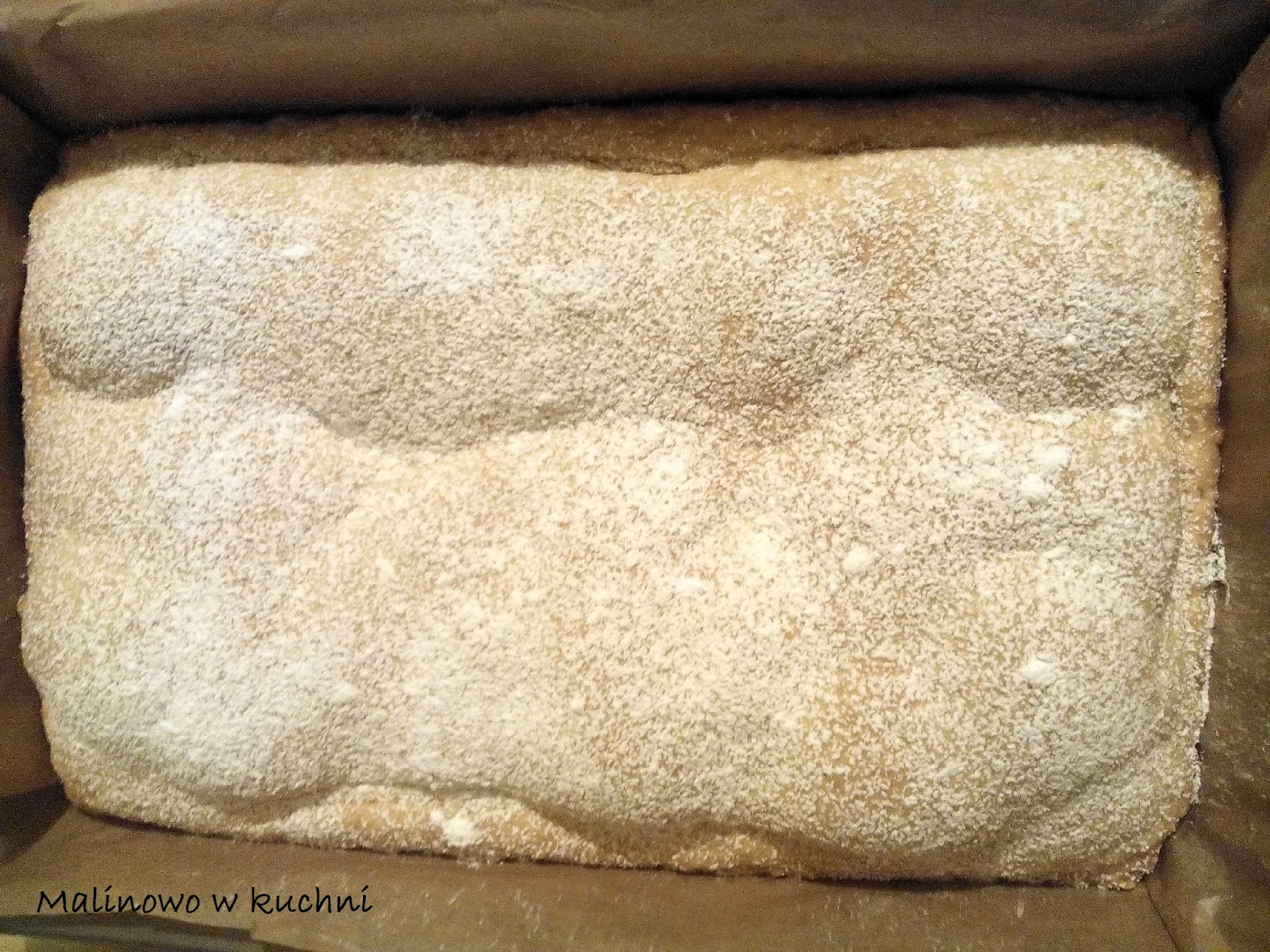 Przygotowanie:Mąkę wymieszać z cukrem pudrem, cukrem waniliowym oraz proszkiem do pieczenia. Dodać jajko, margarynę oraz serek waniliowy. Zagnieść elastyczne ciasto. Następnie ciasto podzielić na dwie równe części. Jedną część ciasta rozwałkować i wylepić dno blachy (20x32).