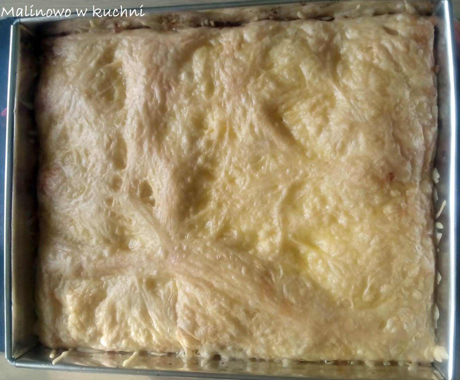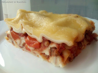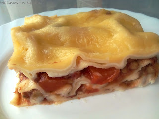 Na dno formy wylać sos beszamelowy, na to ułożyć makaron, sos czerwony, beszamel, makaron, sos czerwony, beszamel, makaron i beszamel (można dodać jedną warstwę i zrobić 3). Piec ok. 40 minut w 180-200*C. Po tym czasie lasagne posypać serem i piec jeszcze ok. 20 minut. SMACZNEGO!!!