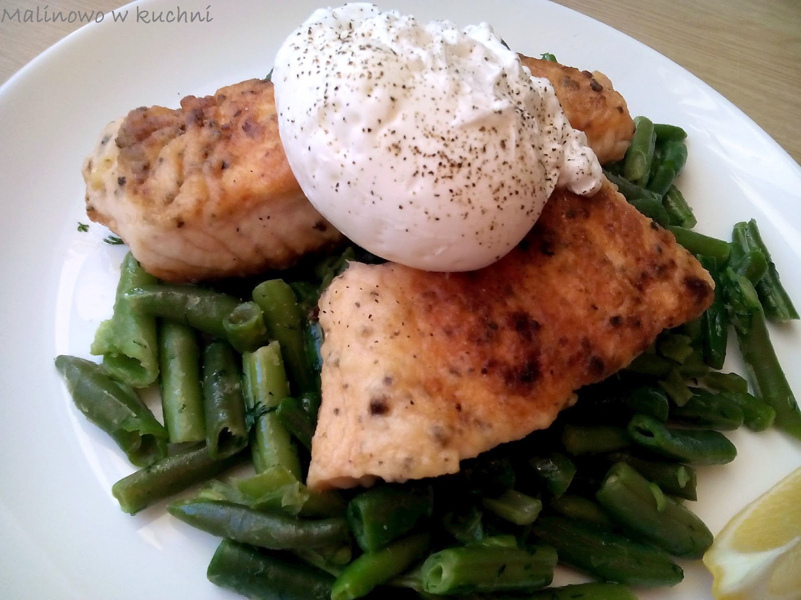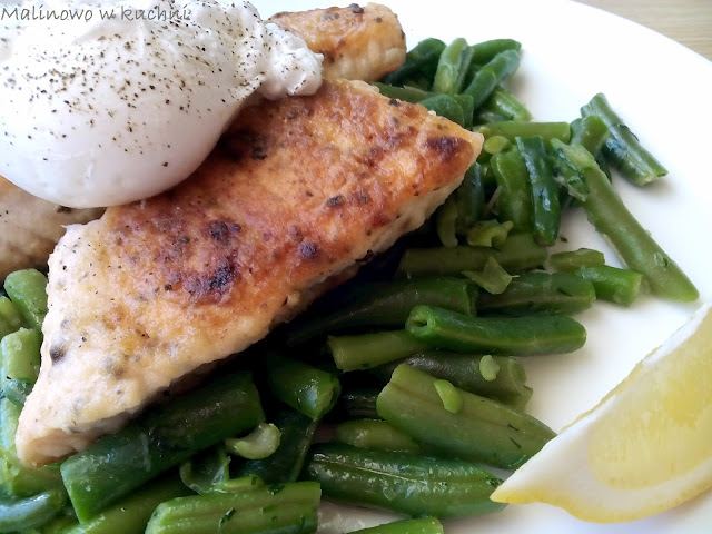 Na talerzach serwować łososia na porcji fasolki, z jajkiem na wierzchu i ćwiartką cytryny. SMACZNEGO!!!