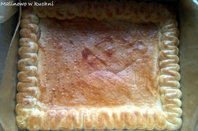 Wszystkie składniki zagnieść. Ciasto podzielić na 2 części (mniejszą i większą), wstawić do lodówki na ok. 30 minut. Większe ciasto wyjąć z lodówki, rozwałkować i wyłożyć nim blachę (20x25 cm wyłożoną papierem do pieczenia). Z mniejszego ciasta zrobić wałeczki i zawinąć je na bokach ciasta, tak jak jest to pokazane na zdjęciu. Ciasto posmarować białkiem i piec w temp. 180*C ok. 25 minut, do zarumienienia (jeśli na cieście w czasie pieczenia zrobi się górka, to nic, po wystudzeniu opadnie). Upieczone ciasto ostudzić i wyłożyć na nie kajmak. Udekorować. SMACZNEGO!!!