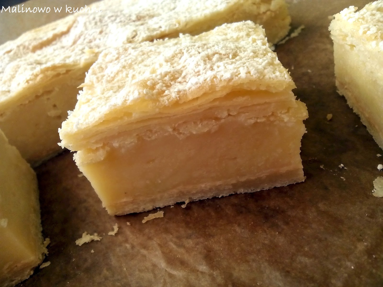 Jajka wymieszać z mąkami i szklanką mleka. Pozostałe mleko zagotować razem z cukrem i kaszą manną. Dodać jajka z mąką i gotować na małym ogniu, aż do powstania gęstej, jednolitej masy. Gorącą masę wlać na placek i przykryć drugim. Posypać cukrem pudrem. SMACZNEGO!!!