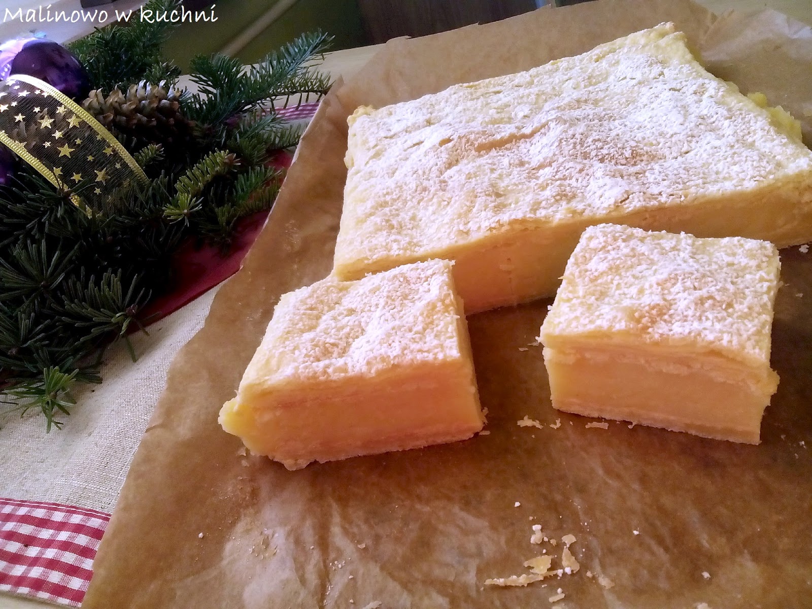 Jajka wymieszać z mąkami i szklanką mleka. Pozostałe mleko zagotować razem z cukrem i kaszą manną. Dodać jajka z mąką i gotować na małym ogniu, aż do powstania gęstej, jednolitej masy. Gorącą masę wlać na placek i przykryć drugim. Posypać cukrem pudrem. SMACZNEGO!!!
