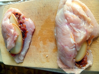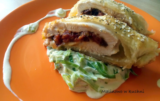 Cebulkę zeszklić na oliwie lub na zalewie z suszonych pomidorów. Dodać posiekany ząbek czosnku. Pomidory sparzyć, obrać ze skórki i pokroić w kostkę, dodać do cebulki. Suszone pomidory pokroić w paski i również dorzucić na patelnie. Gdy pomidory się uduszą dodać koncentrat, posiekaną bazylie, sól i pieprz. Piersi oczyścić, umyć i rozciąć tak, by powstała kieszonka. Do kieszonki włożyć farsz i plasterki sera. Pierś ułożyć na połówce ciasta francuskiego. Mięso zawinąć w ciasto, posmarować z wierzchu roztrzepanym jajkiem, można posypać makiem lub sezamem. Piec w temp. 180*C ok. 20-30 minut.Sos:Pora pokroić w talarki, wrzucić na patelnię i zalać śmietanką. Dusić do momentu, aż por będzie miękki. Doprawić do smaku solą i pieprzem. Sos wyłożyć na środek talerza, Kurczaka pokroić w plastry i ułożyć na porach.