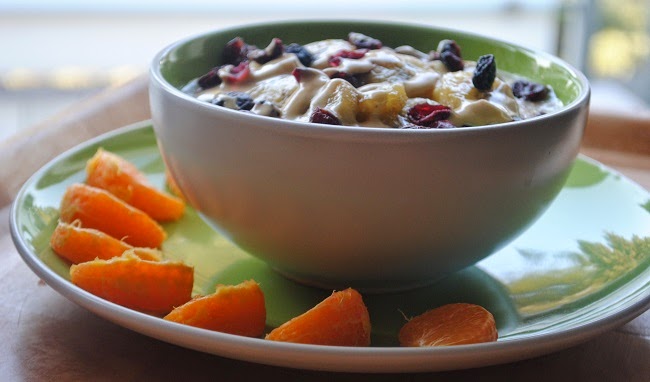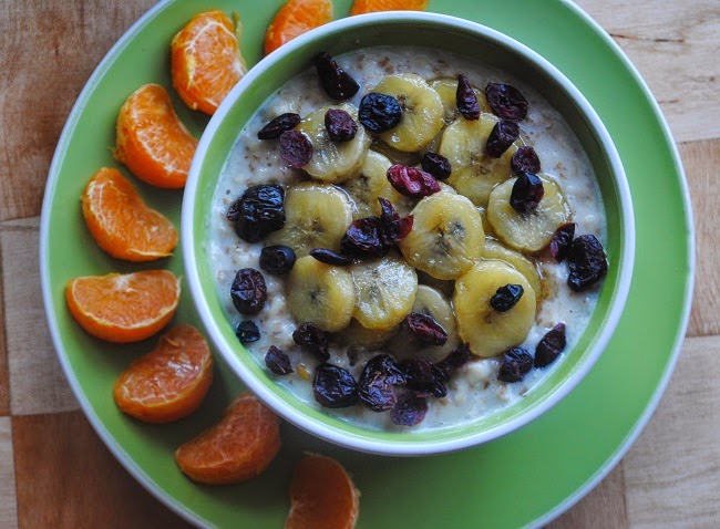 Owsianka z bananem karmelizowanym w syropie klonowym, żurawiną i tahini