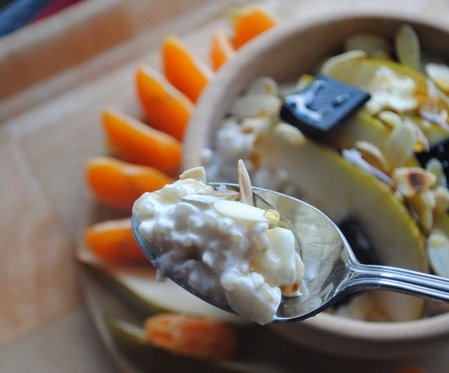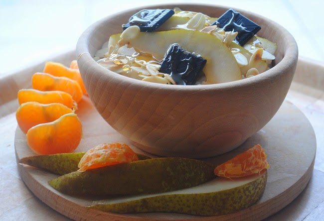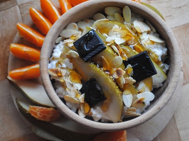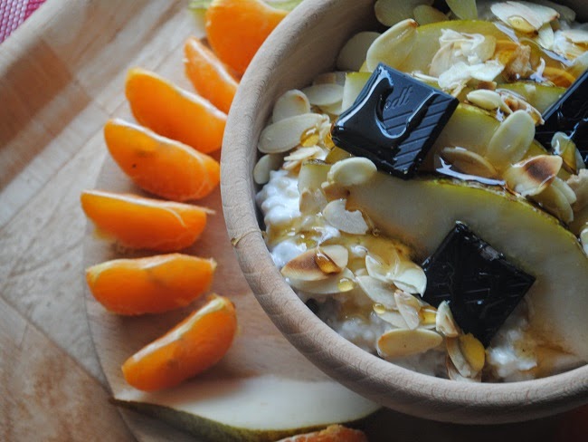 Jogurtowy brązowy ryż pełnoziarnisty z gruszką, płatkami migdałów, miodem gryczanym i gorzką czekoladąMandarynkaPrzepis jako taki chyba zbędny.
