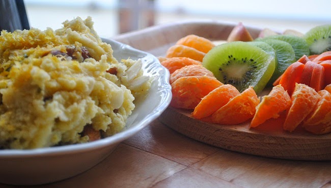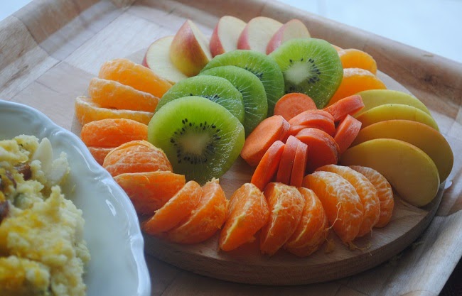 Marchewka, kiwi, mandarynka, jabłkoKasza jaglana ugotowana na wodzie, wymieszana z sokiem z połowy cytryny, podana ze skórką cytrynową i namoczonymi bakaliami, polana miodem.