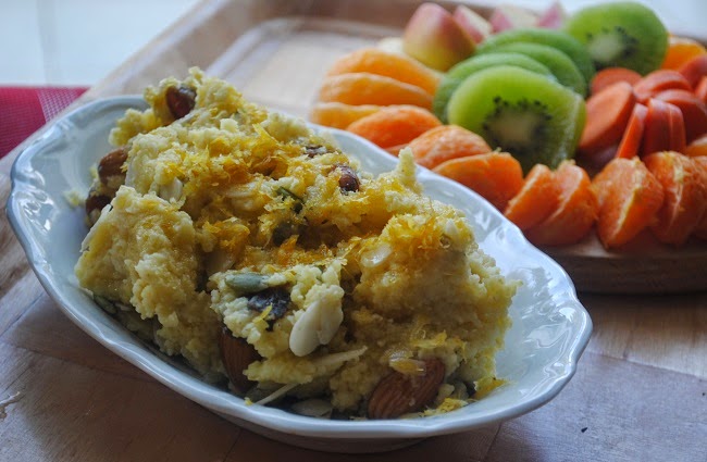 Cytrynowa kasza jaglana z migdałami, pestkami dyni, suszonymi morelami i miodem gryczanym