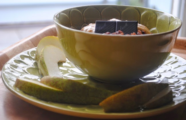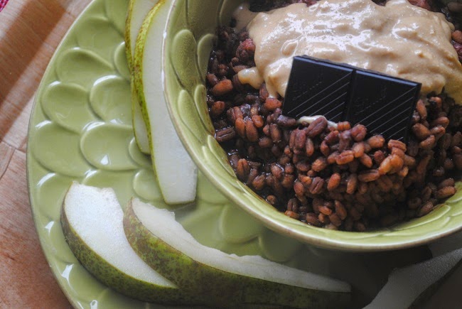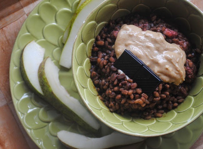 Karobowo- truskawkowy pęczak z masłem z nerkowców*, gorzką czekoladą, gruszką*masło z orzechów nerkowca z kawałkami fistaszków i solą morską z M&SPęczak ugotowany na wodzie, pod koniec dodany karob i rozmrożone truskawki i gotowany jeszcze chwilę. Podany z dodatkami.