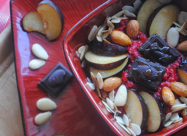 Owsianka z burakiem ze śliwką, gorzką czekoladą, migdałami i miodem gryczanym