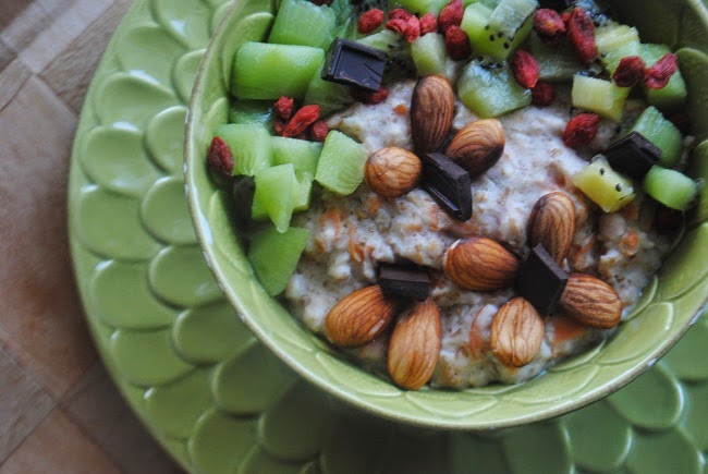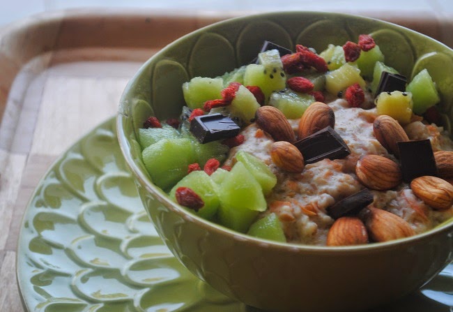 Owsianka marchewkowa z kiwi, migdałami, goi, gorzką czekoladą
