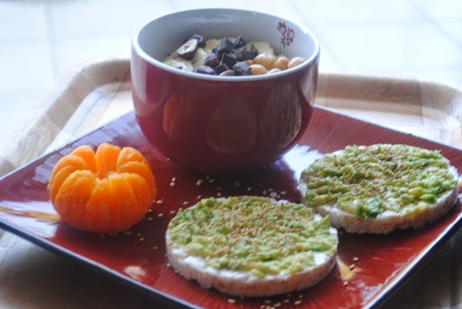 Jogurt naturalny z bananem, ciecierzycą, laskowymi i gorzką czekoladą Wafle ryżowe z awokado*, sezamem i solą himalajską