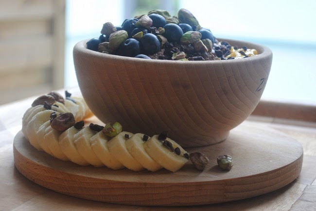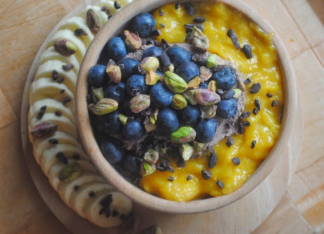 669. Czekoladowy krem z tofu z borówkami, różanym musem z mango, kakaowcem i pistacjami