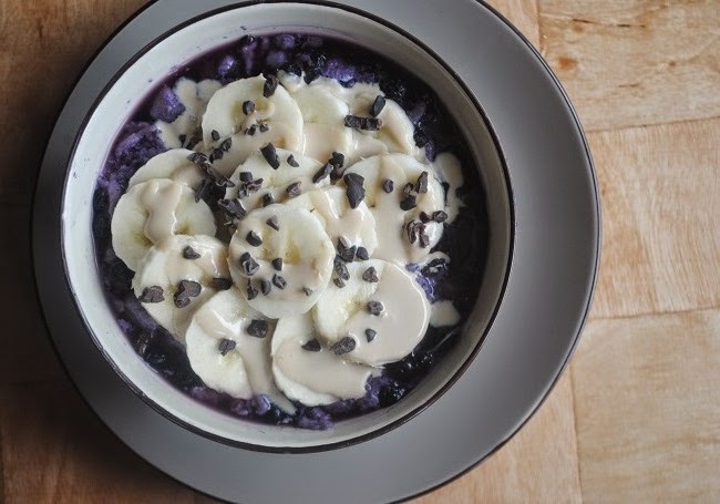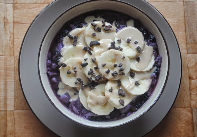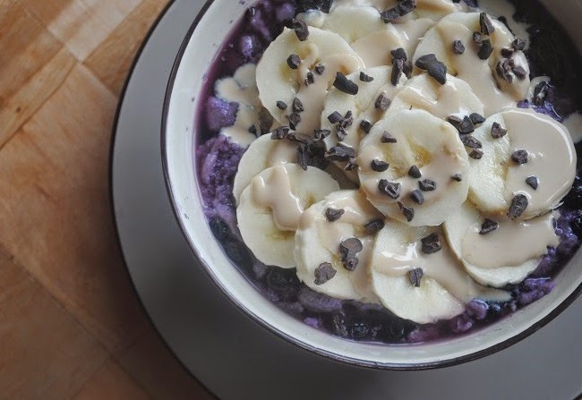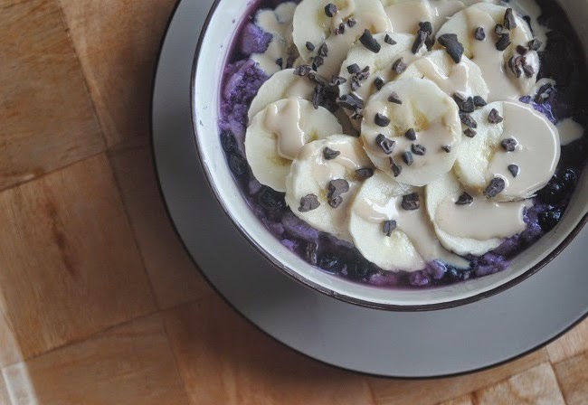 Różane kluski lane na mleku z jagodami z bananem, tahini i ziarnem kakaowcaPrzepis: