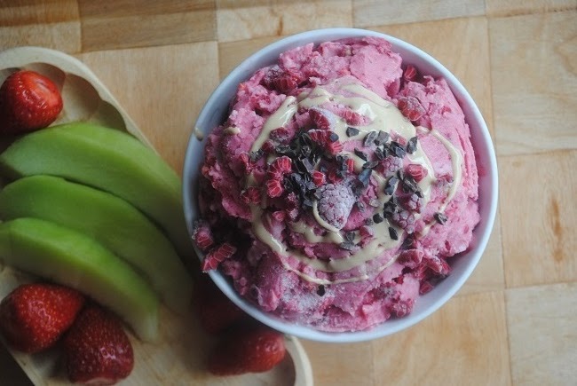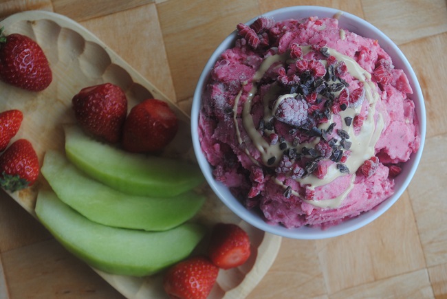 Jogurtowe lody: banan- malina- woda różana z tahini i ziarnem kakaowca Melon, truskawki