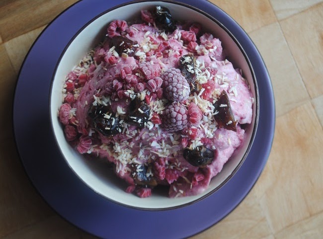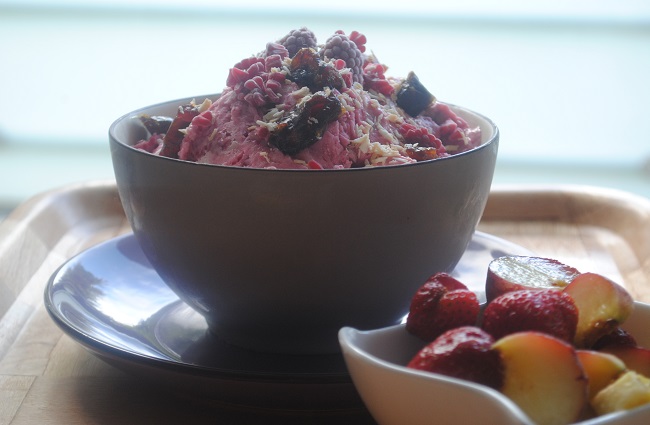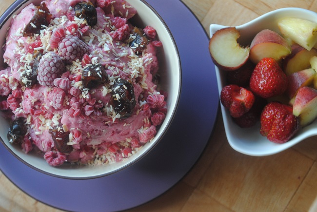 Jogurtowe lody bananowo- malinowe ze świeżymi daktylami, tahini, wiórkami kokosa Truskawk, ufo, ananas