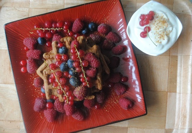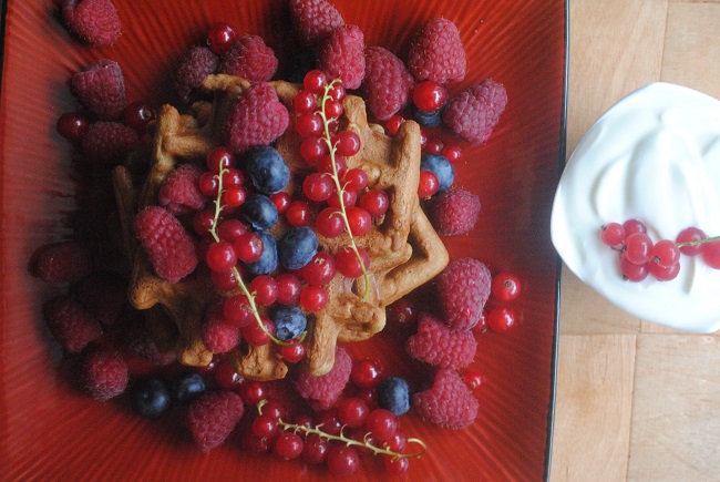 Sezamowe gofry z malinami, porzeczkami i borówkami z cukrem kokosowym i masłem orzechowymJogurt naturalnyPrzepis: