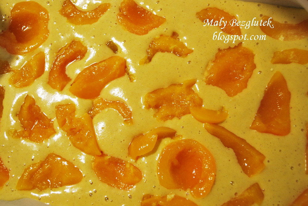 Na wierzchu ułożyć plastry brzoskwini pokryte od zewnątrz mąką (mąką do ciasta).