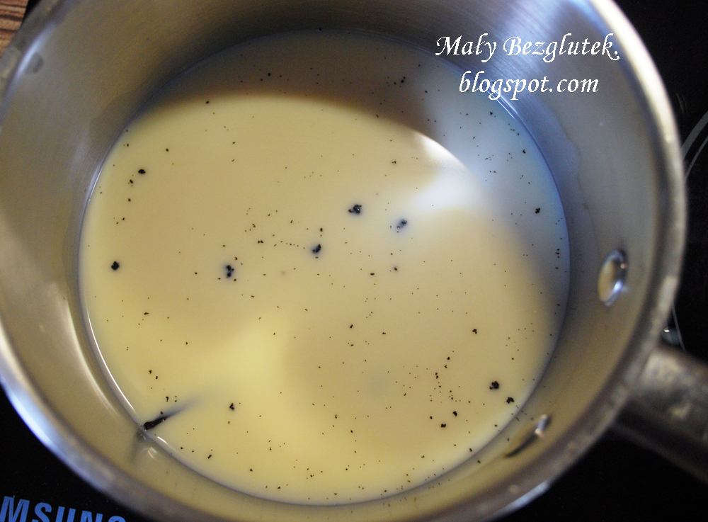 Przygotowanie: Mleko sojowe wlać do garnka o głębokim dnie. Laskę wanilii przekroić wzdłuż i końcówką noża wyskrobać ziarenka, które następnie dodać do mleka sojowego wraz z przekrojonymi laskami. Podgrzewać chwilę mleko z wanilią na małym ogniu, raz po raz mieszając. Następnie odstawić na bok do wystygnięcia.