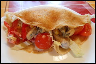 Na naleśnik ułożyć warstwami kolejne składniki, polać sosem a następnie zwinąć naleśnik.