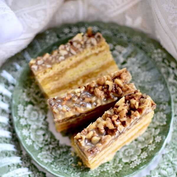 Zdecydowanie ciasto, które zrobiło furorę (ulubione słowo mojej mamy :)) podczas tych Świąt Bożego Narodzenia. Kruche blaty przełożone masą jabłkową a wierzch udekorowany karmelem z orzechami. Ja nie wiem czy do szczęścia potrzeba i czegoś więcej opróc...