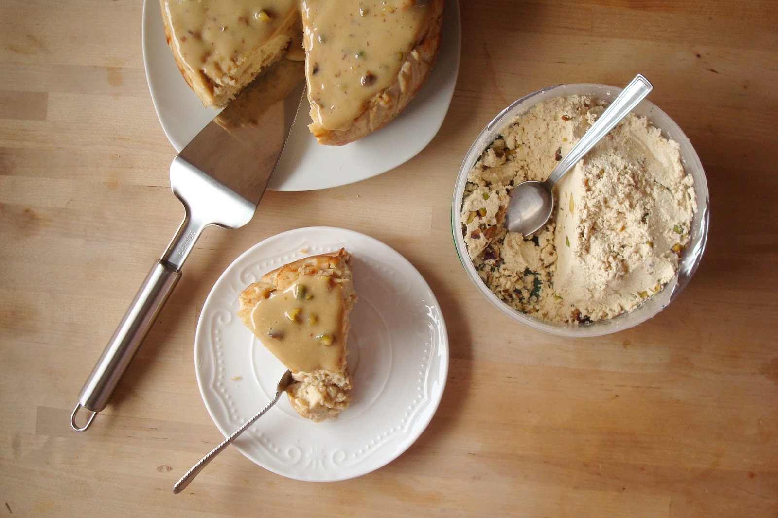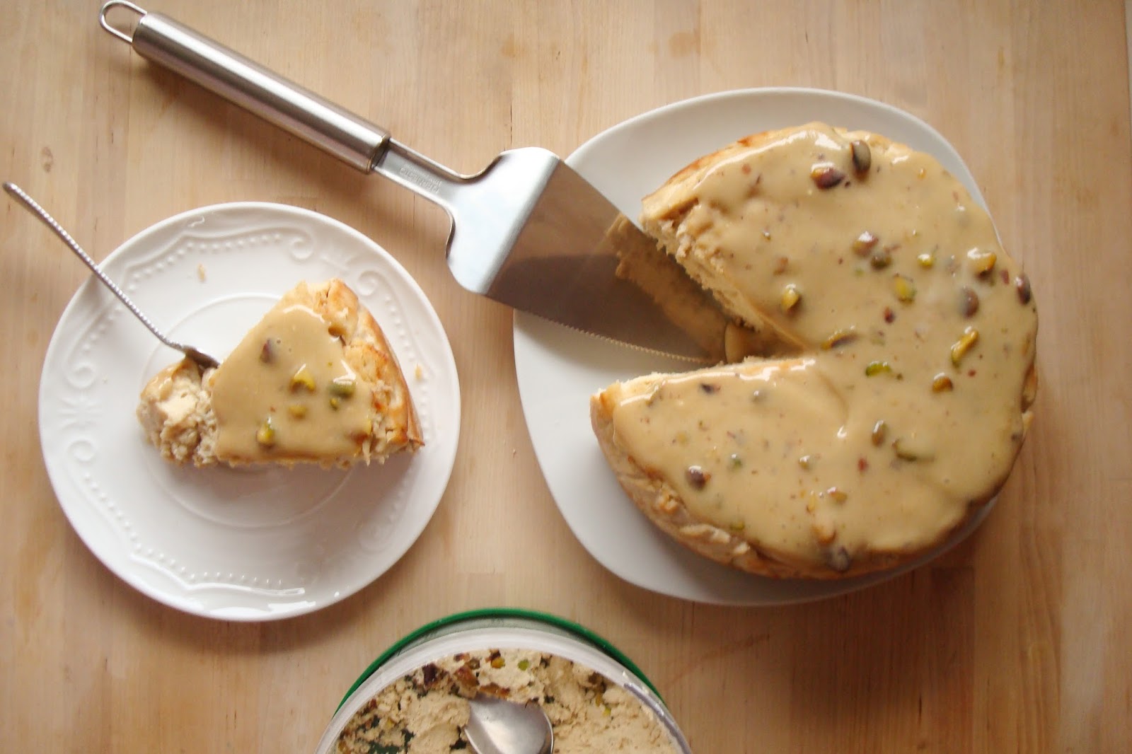 ledwie zaczęte pudełko chałwy w lodowce. Jak to? Nie zjadłaś? No a ja, chociaż naprawdę jestem slodyczowym łasuchem, chałwy zjem najwyżej kawałeczek do mocnej kawy, od czasu do czasu. Miałam więc zapas pistacjowej chałwy i tak wpadłam na pomysł, że chałwowy tofurnik to będzie właśnie to, co tygrysy polubią najbardziej.