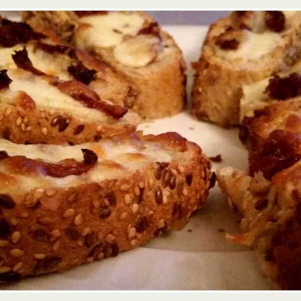 Szybkie, pyszne, dietetyczne grzanki idealne na urodziny, imprezę czy do przygotowania dla niespodziewanych gości! :)Pełnoziarniste bułki lub chlebek kroimy na małe kromeczki.Na kromeczki nakładamy cienkie plasterki sera mozzarella.Smarujemy je delikat...