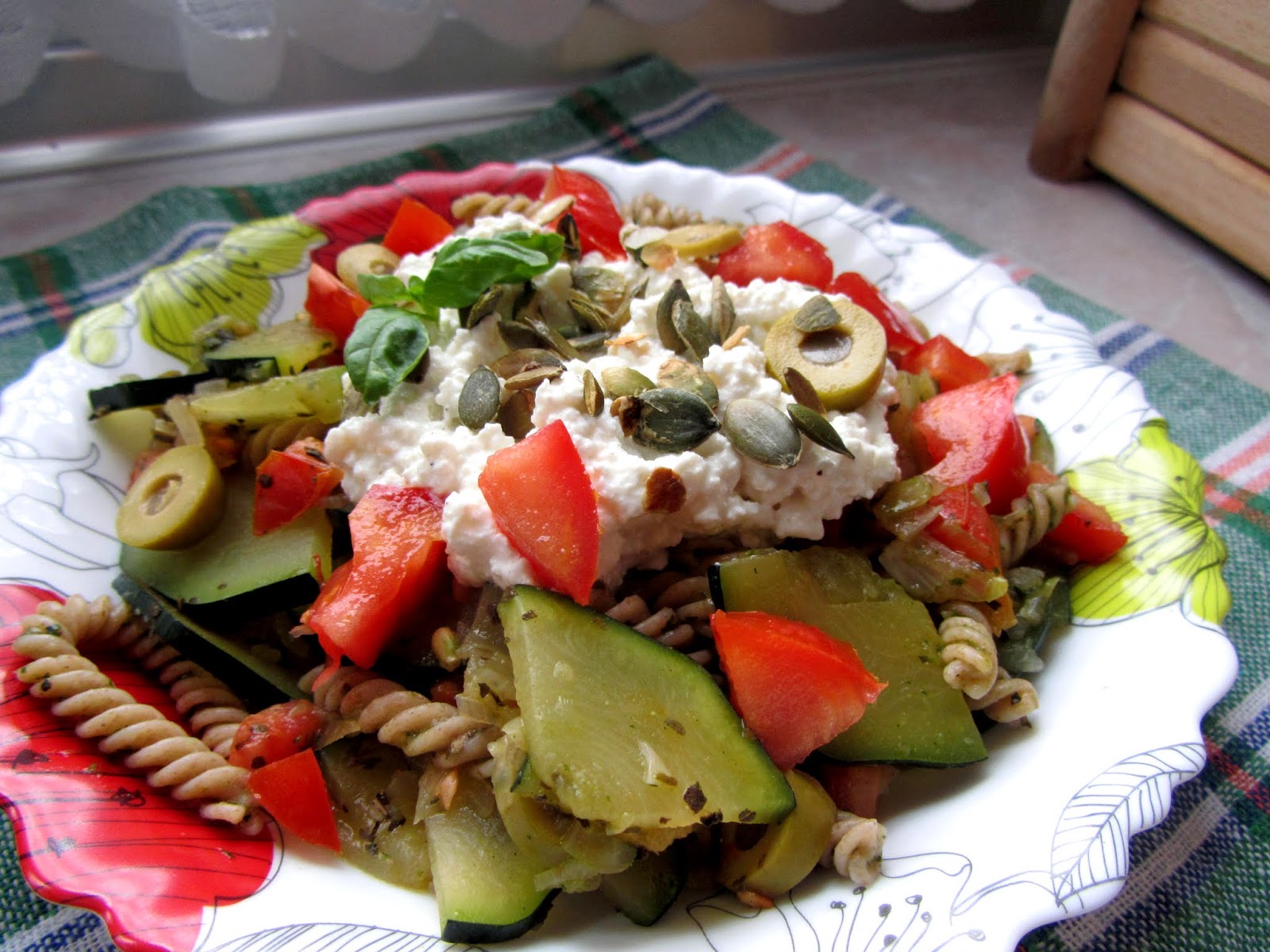 Posiekaną cebulę wrzucić na rozgrzaną patelnie, gdy zacznie się rumienić wrzucić również przepołowione w cienkie plasterki cukinię, podlać odrobiną wody i dusić pod przykryciem ok 5 min, aż zmięknie, pod sam koniec dodać dorzucić pokrojonego w kostkę pomidora oraz oliwki. Warzywa doprawić bazylią, szczyptą soli i pieprzem.