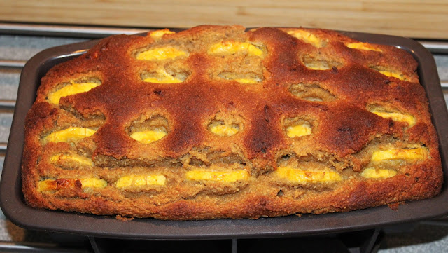 Pozostawionego plantana kroję w plasterki i wciskam na wierzchu ciasta.