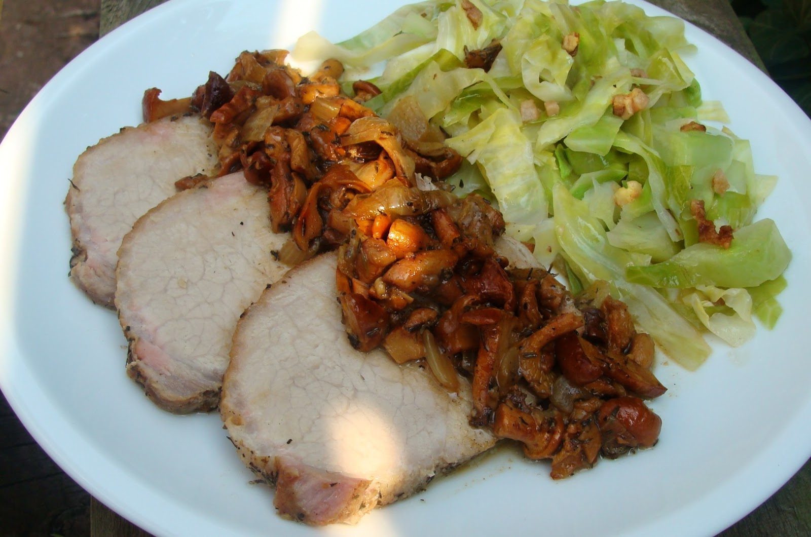 Schab wyciągam na deskę, kroję w plastry, podaję z kurkami oraz kapustą.