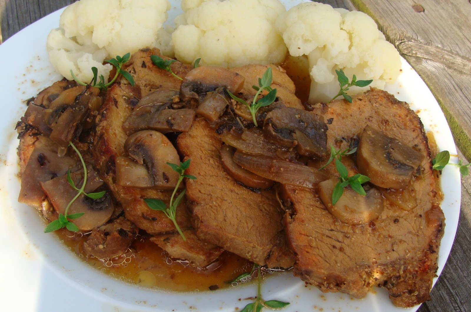 Wyciągam schab na deskę, kroję w plastry, przekładam z powrotem na patelnie