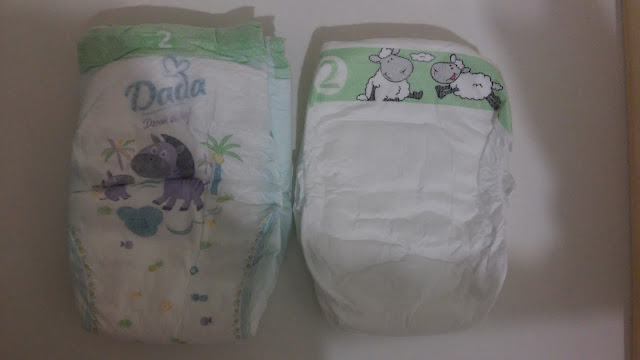 Polecono mi na samym początku Dadę. I 1 kupiliśmy Dadę, wszystko było ok. Wygodne, zero problemów i 1 kupa na zewnątrz (przewijał tata, więc się nie liczy). W paczce ze szpitala dostałam Pampersy, ale nie zachwyciły mnie na tyle, by je kupować. Pampersy rzeczywiście wydawały się być miększe, ale czytając teksty marketingowe z ulotki ubawiłyśmy się nieziemsko. Np. standardowy tekst: 12h. No kto by chciał chodzić z kupą w majtkach przez 12h? Ja nie, więc zakładam, że moje dziecko również nie. Zwłaszcza, że jego skóra "ma" dopiero jakieś parę dni.