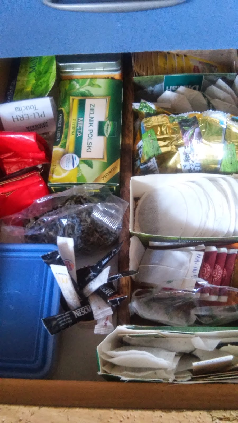 Poniżej herbaty stojące na szafce, bo w szufladzie się nie mieszczą.