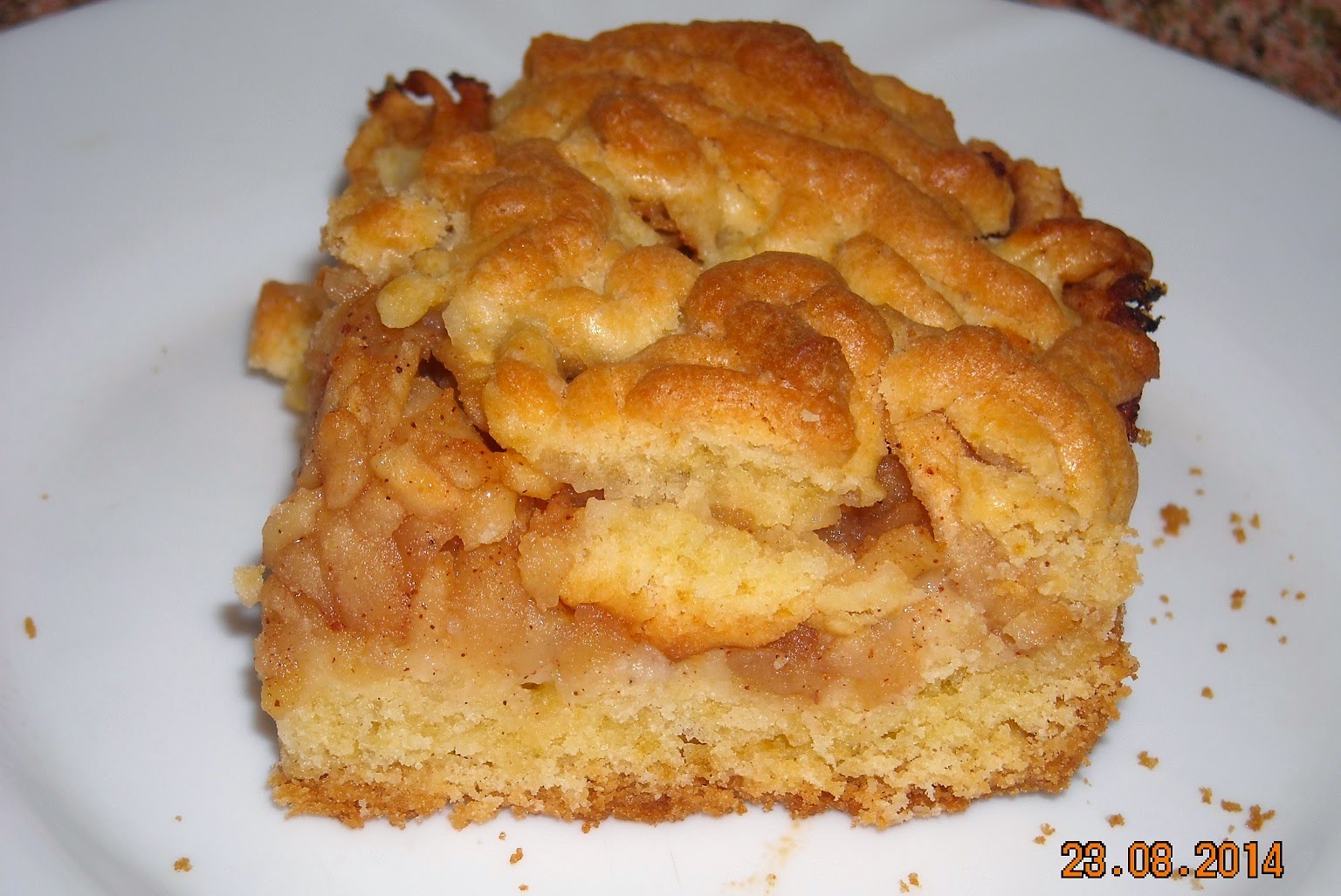 z grubymi oczkami. Skropić sokiem z cytryny, wymieszać z cukrem pudrem. Większą częścią ciasta wylepić dno posmarowanej tłuszczem i wysypanej bułką tartą blach. Na to wyłożyć jabłka, posypać cynamonem. Na wierzch zetrzeć pozostałe ciasto. Piec 40 min w 180ºC. Prze podaniem można posypać cukrem pudrem.