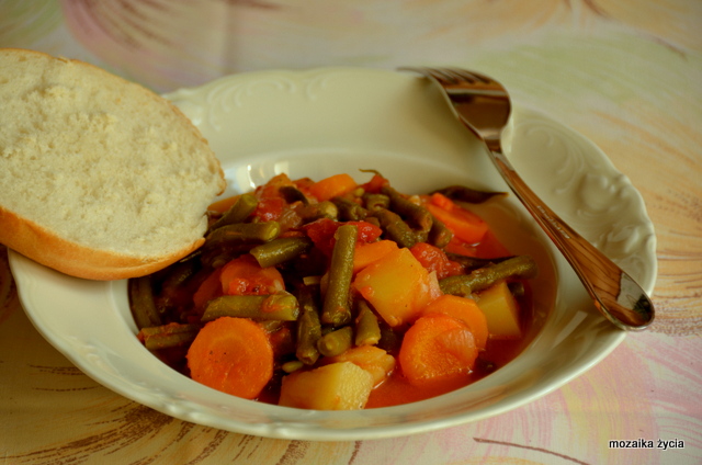 W rondlu, w którym będziemy gotować potrawę rozgrzać oliwę, zeszklić na niej cebulę. Następnie dodać marchewkę, całość smażyć przez chwilę. Dodać fasolkę, jeszcze chwilę smażyć a następnie dodać obrane ze skórki i pokrojone w kostkę pomidory, pastę paprykową i przyprawy. Do całości dodać bulion warzywny w takiej ilości aby w co najmniej ½ zakrył warzywa. Całość zagotować, dodać ziemniaki i całość dusić na średnim ogniu do miękkości warzyw – ale nie mają prawa się rozgotować.