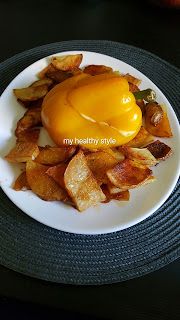 TUTAJ). Postanowiłam zmodyfikować go i dostosować do zawartości mojej lodówki. W ten sposób powstała faszerowana papryka. Na talerzu idealnie komponuje się z jesiennymi barwami za oknem.