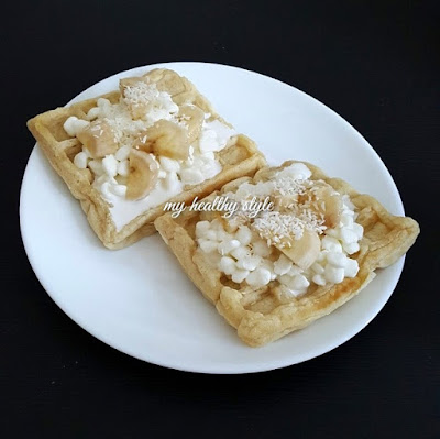 6. Na gotowe gofry wyglądamy nasze ulubione dodatki. Ja wybrałam serek wiejski i żurawinę z malinami, zaś kolejnego dnia serek wiejski z bananami i wiórkami kokosowymi.