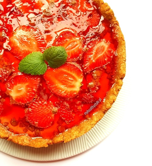 7. Na upieczonym i przestudzonym cieście wykładamy truskawki przekrojone na połówki lub w plasterki.