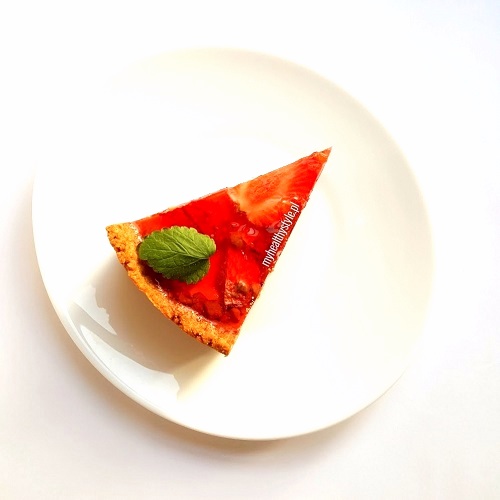 7. Na upieczonym i przestudzonym cieście wykładamy truskawki przekrojone na połówki lub w plasterki.