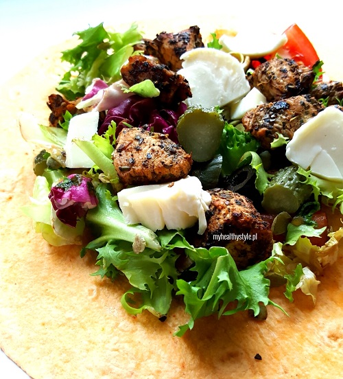 3. Na tortilli układamy sałatę oraz pokrojone warzywa oraz mozzarellę.