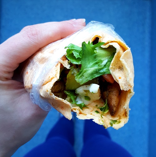 5. Zawijamy tortille tak, jak na zdjęciu - najpierw dół, potem boki. Jeśli podajemy ją od razu, najlepiej spiąć ją wykałaczkami i zgrillować nieco z zewnątrz. Jeśli zaś bierzemy ją na wynos, wówczas od razu zawijamy w folię.