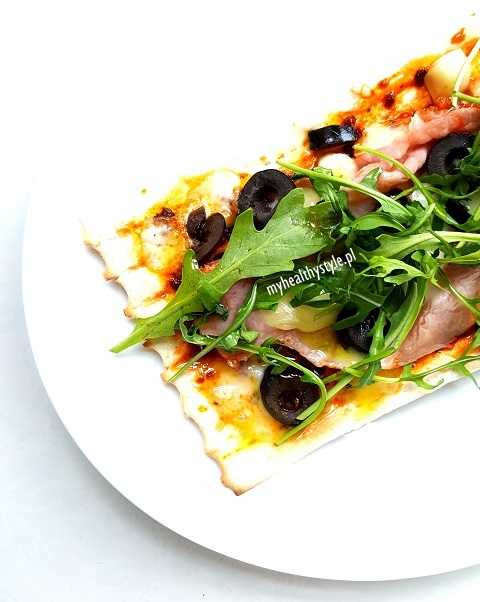 2. Następnie układamy ulubione dodatki - szynkę, mozzarellę oraz opcjonalnie oliwki i pomidory suszone.