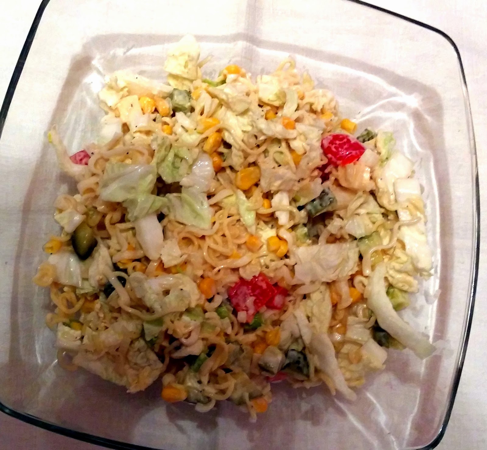 Makaron z zupek odcedzamy na sitku i dodajemy do sałatki.