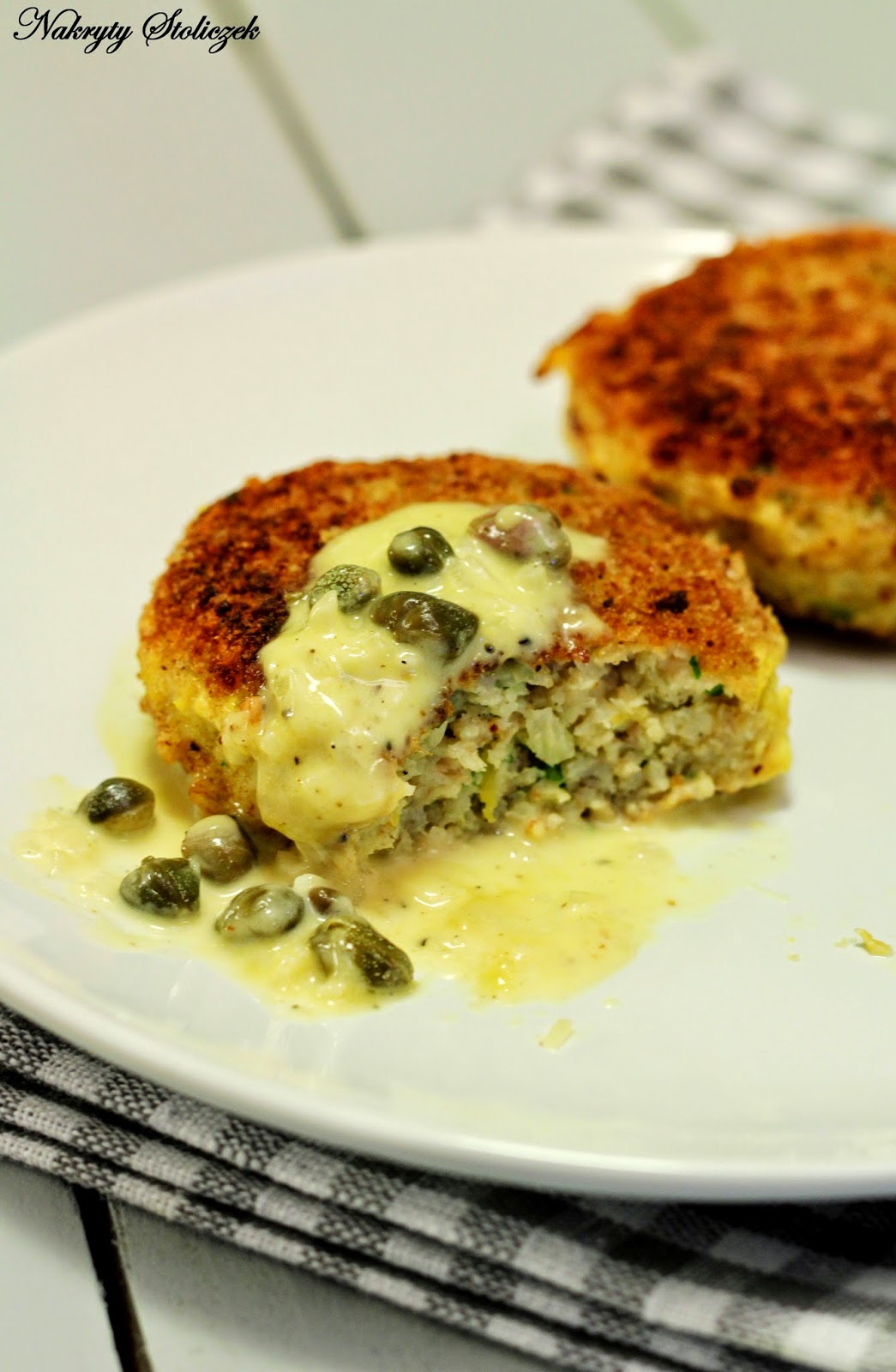 Kolejny pomysł na rybne kotleciki, tym razem w towarzystwie kremowego sosu na bazie białego wina z dodatkiem kaparów. Przygotowując sos należy pamiętać, żeby ściągnąć go z palnika kiedy tylko zacznie gęstnieć i od razu podawać, w przeciwnym razie możemy go „przeciągnąć” i sos będzie zbyt gęsty. Kotleciki podałam z pieczonymi, chrupiącymi łódeczkami ziemniaczanymi oraz marchewką z groszkiem.