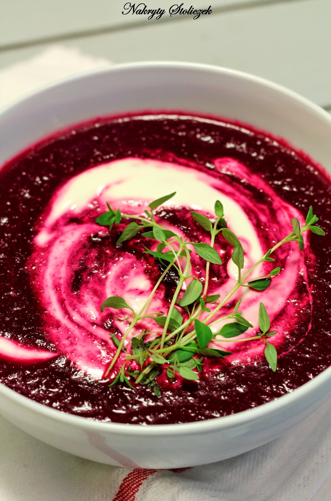 Pyszna, gęsta zupa z pieczonych buraków, lekko słodka z przełamującym smakiem cytryny i tymianku. Ciekawa alternatywa dla tradycyjnego barszczyku. U mnie na wigilijnym stole nie może zabraknąć czystego, czerwonego barszczu, ale taki krem można przygotować dla gości w pozostałe dni świąt na dobry początek biesiady :).