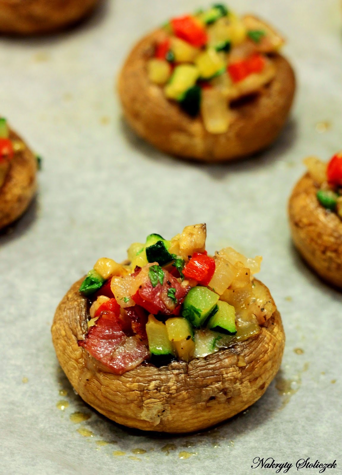Delikatnie usuwam nóżki pieczarek, połowę z nich odstawiam, resztę wyrzucam. Następnie wydrążam środek pieczarek. Smaruję kapelusze pędzelkiem zamoczonym w oliwie. Układam je na blasze wyłożonej papierem do pieczenia, w środku posypuję odrobiną soli i pieprzu. Cebulę i czosnek obieram, cebule kroję w kostkę, czosnek drobno siekam. Nóżki pieczarek również siekam. Paprykę i cukinię kroję w drobną kosteczkę. Boczek dzielę na mniejsze kawałki. Rozgrzewam patelnię, wrzucam boczek, podsmażam aż wytopi się tłuszczyk, wrzucam cebulę, czosnek i nóżki pieczarek. Smażę przez 1-2 minuty. Następnie wrzucam paprykę i cukinię. W razie potrzeby dodaję odrobinę oliwy. Oprószam solą i świeżo mielonym pieprzem. Smażę przez 2-3 minuty. Przekładam do miski, dodaję ser i pietruszkę, mieszam. Nakładam farsz do pieczarek. Piekę w temperaturze 190 stopni przez około 15 minut.